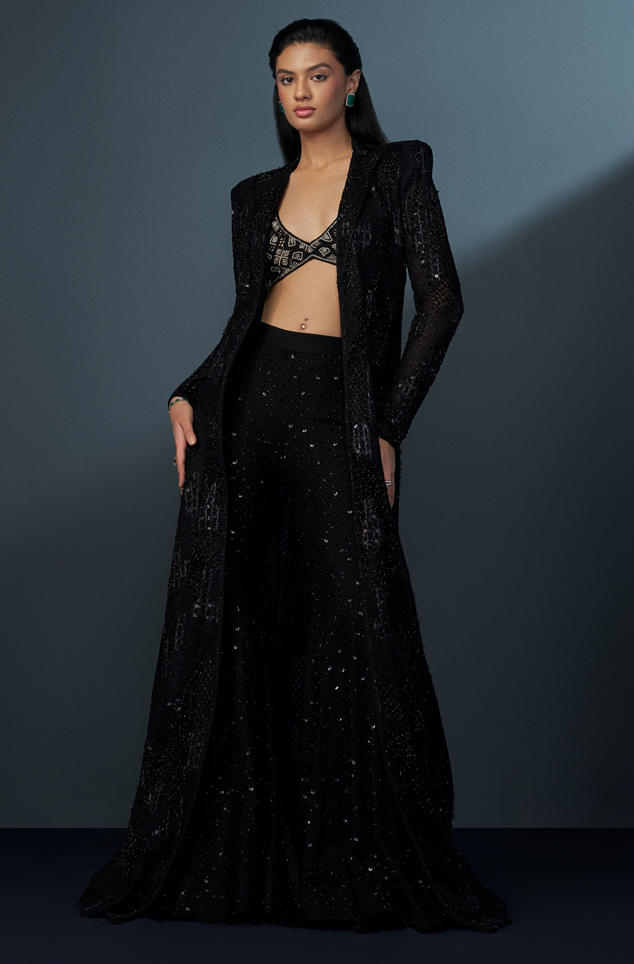 BLACK & GOLD retro blouse paired with the BLACK astral sharara and a BLACK mesh trench coat