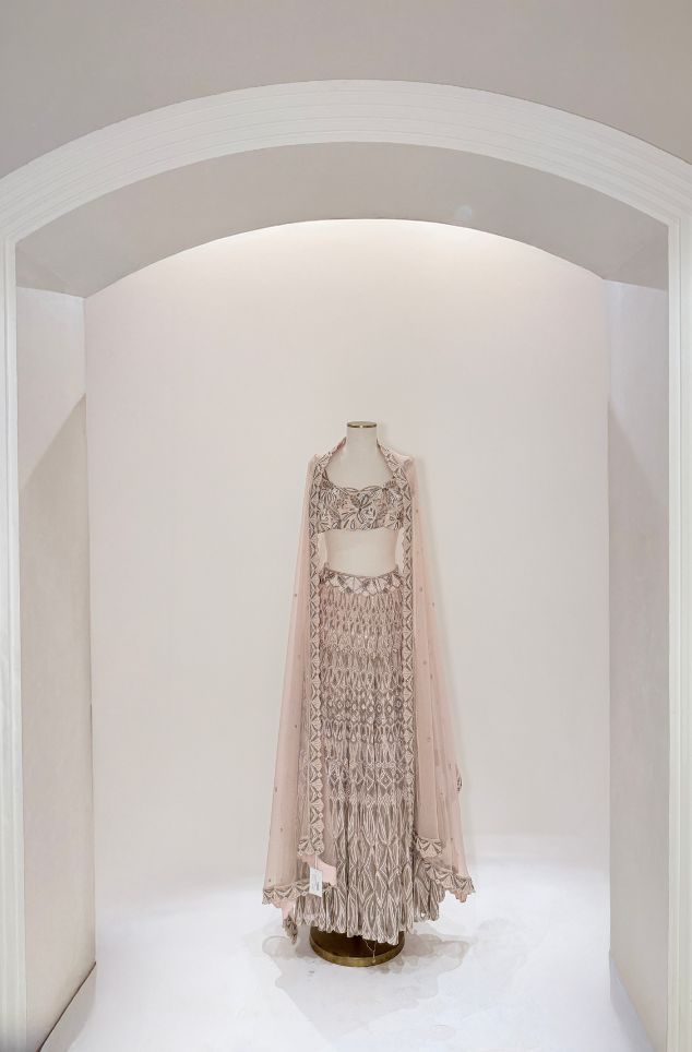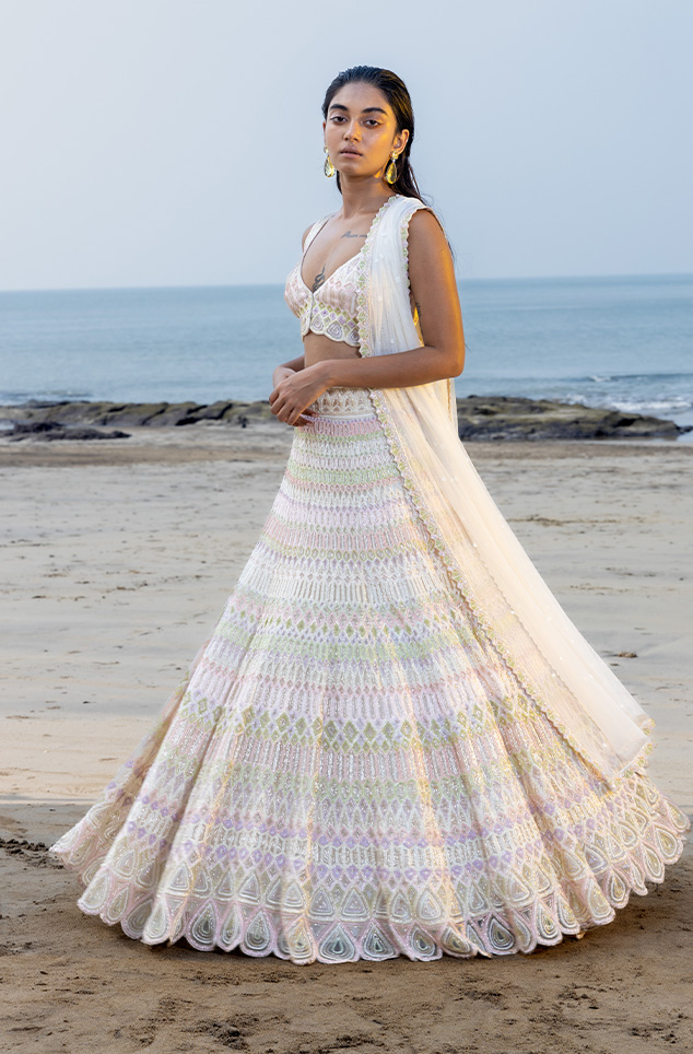 Ivory, gold & pastel shades like lavender, floral green & pink geometric hand embroidered sleeveless blouse lehenga & dupatta.