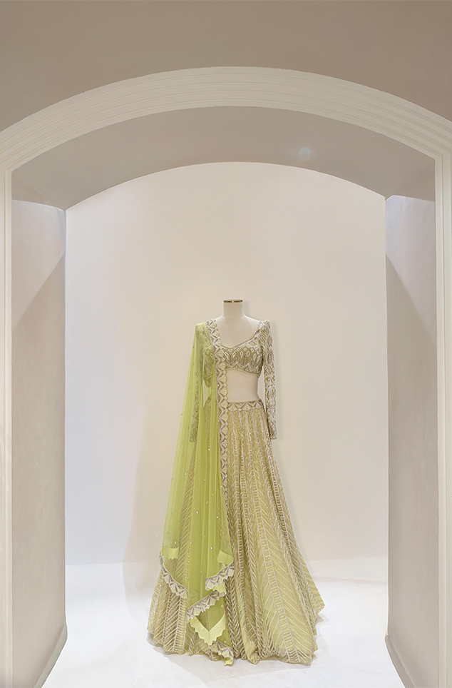 Aqua ivory and gold heavy web-design lehenga paired with suchi blouse & dupatta