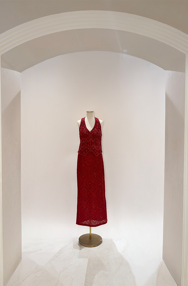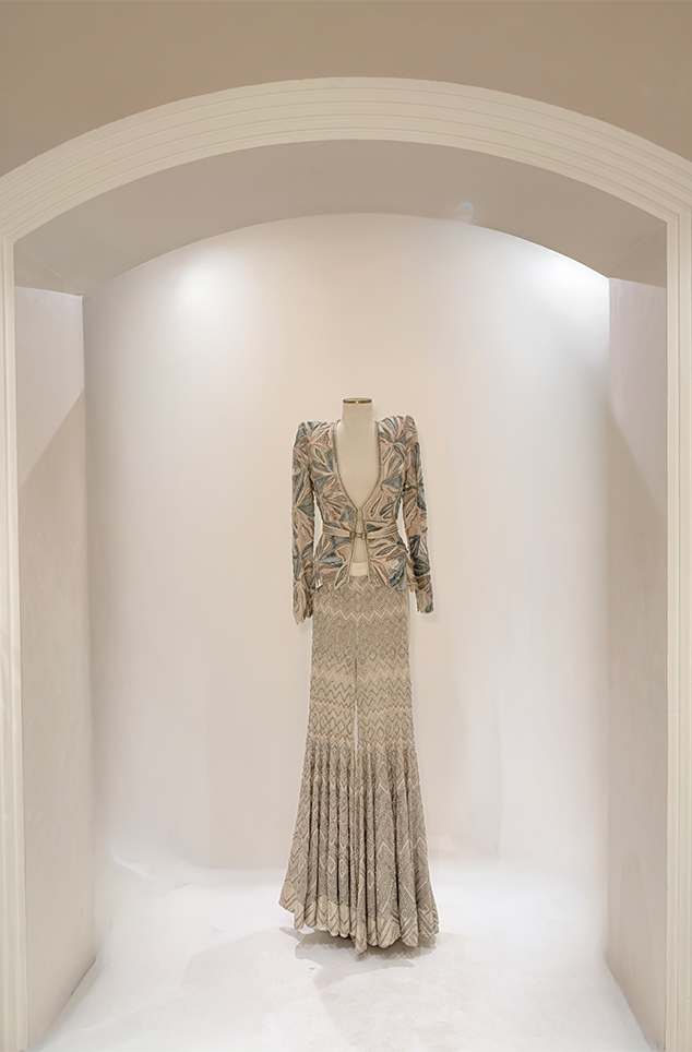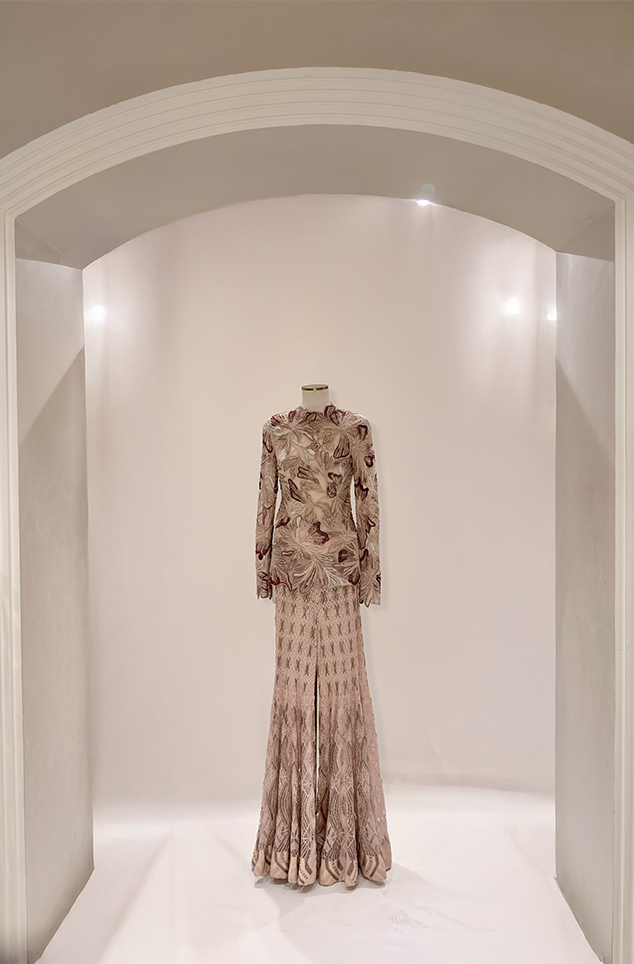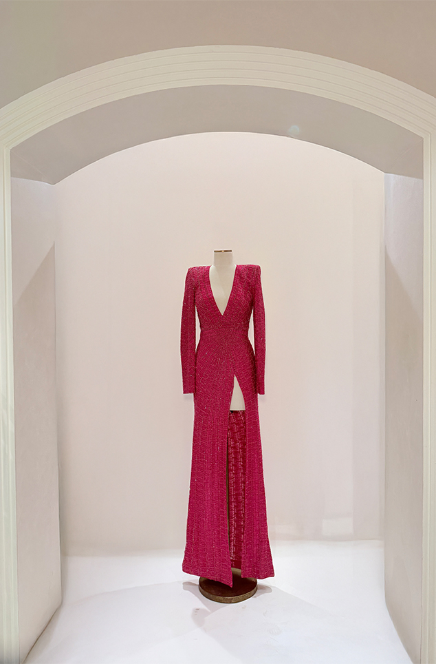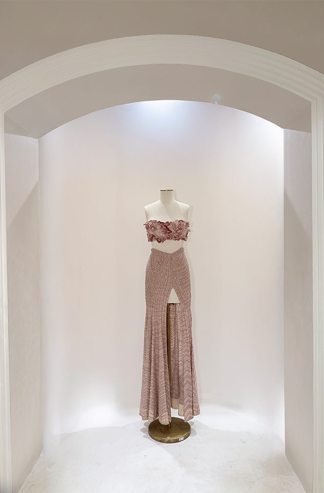 Blush pink ombré floral appliqué bustier paired with the shark-skin textured slit skirt