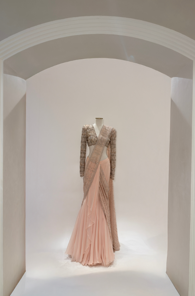 BLUSH PINK ALAMY half organza lehenga saree paired with a traid full-sleeve blouse with power shoulders