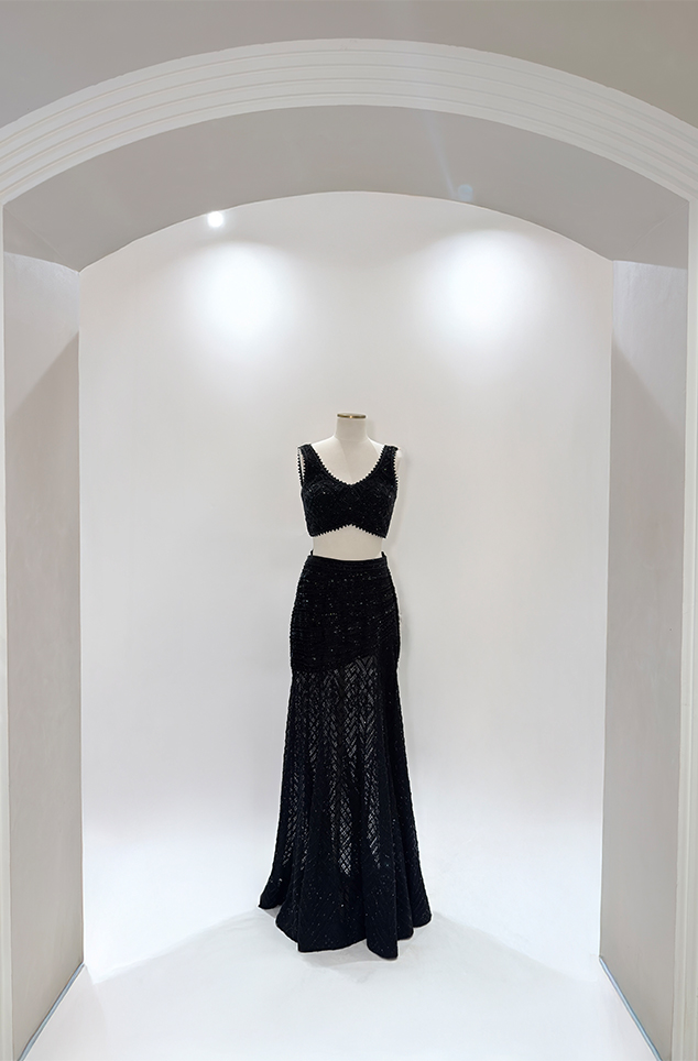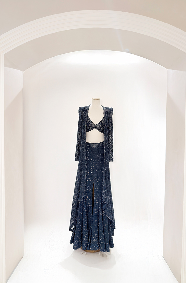 IVORY mesh bodysuit and blazer paired with Cascade sharara with an embellished waistband.