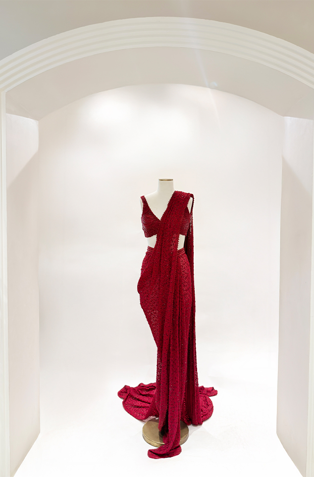 RED triad high neck blouse paired with the ogee pattern lehnga with embellished waistband and dupatta