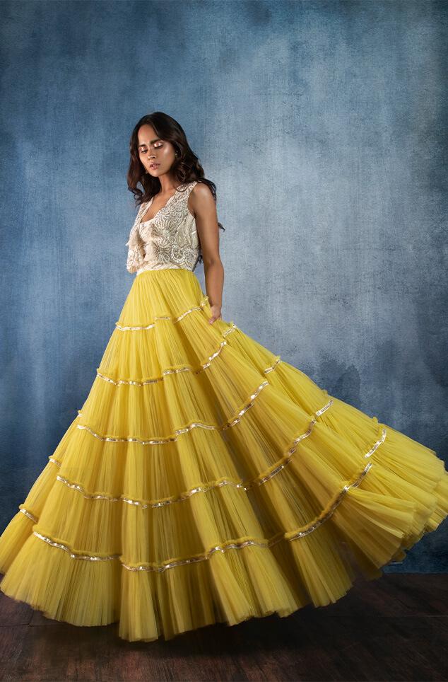 Our signature yellow abstract cap sleeve blouse paired up with our yellow tired skirt and dupatta set.