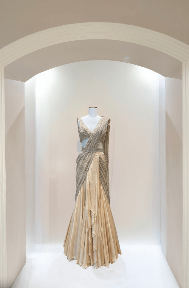 Black, Ivory and gold hand embroidered lehenga, shoulder pad blazers & light block lehenga & belt.