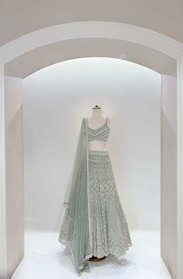 Aqua ivory and gold heavy web-design lehenga paired with suchi blouse & dupatta