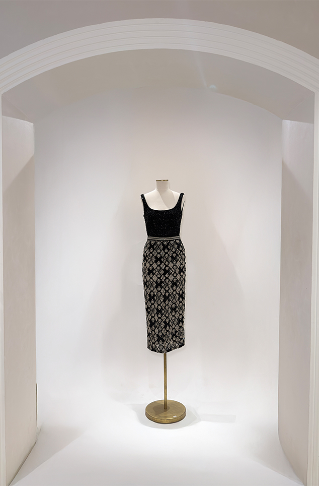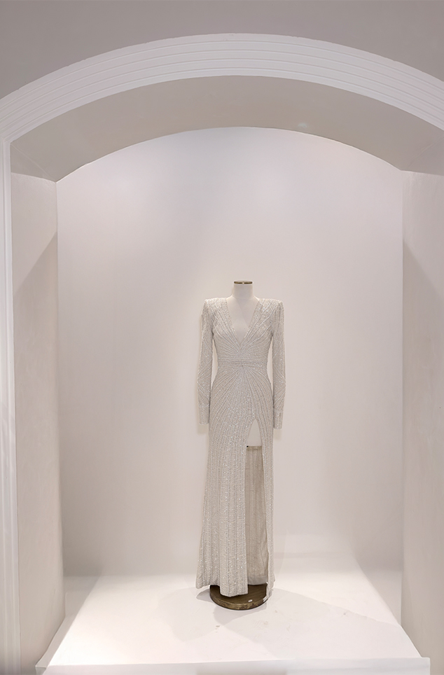 Blush pink ombré floral appliqué bustier paired with the shark-skin textured slit skirt
