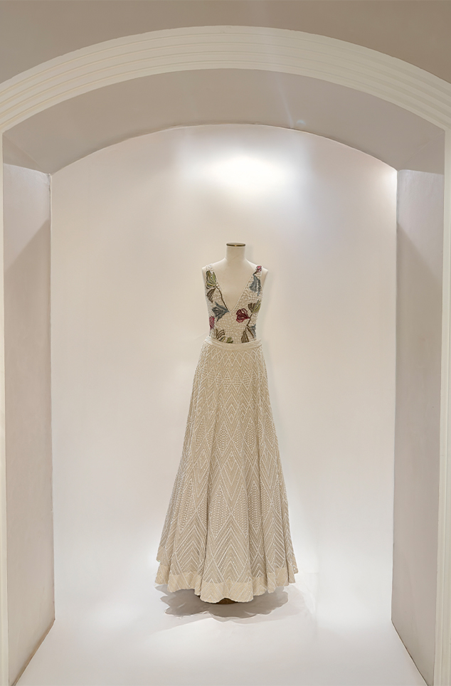 Ivory colorfull floral embroidered bodysuit paired with the Cascade lehenga and an embellished waistband