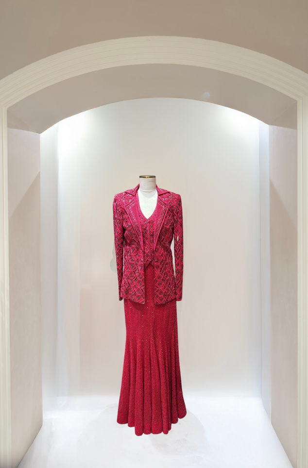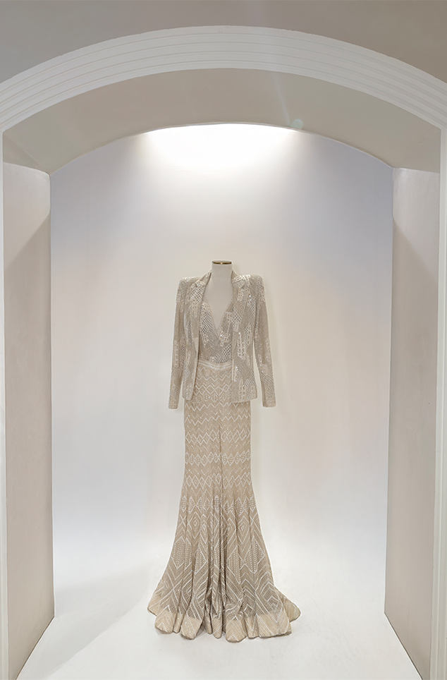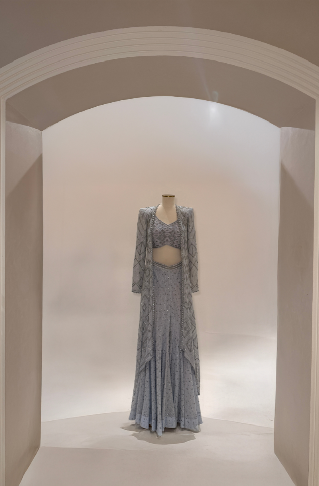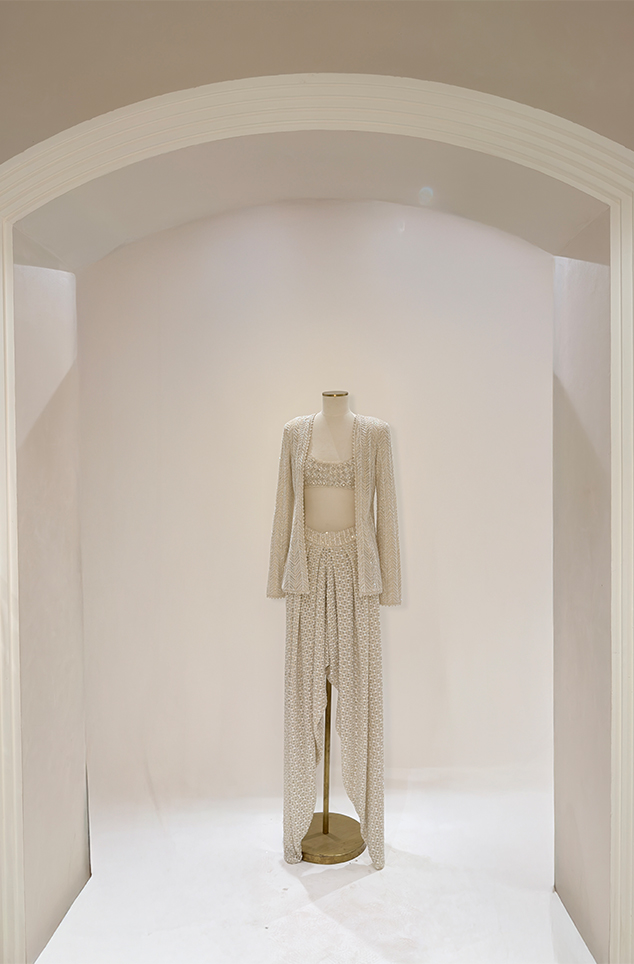 IVORY mesh bodysuit and blazer paired with Cascade sharara with an embellished waistband.