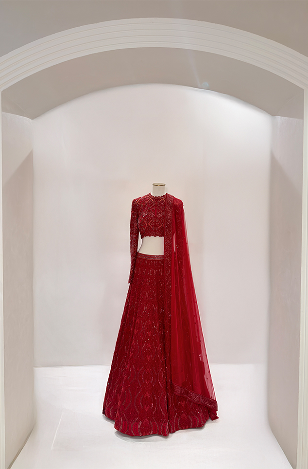 RED triad high neck blouse paired with the ogee pattern lehnga with embellished waistband and dupatta