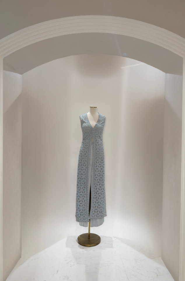 Ice blue Geoflora sleeveless long jacket paired with Linea artwork palazzo with embellished waistband